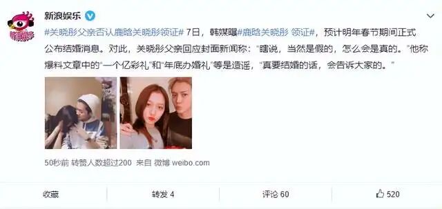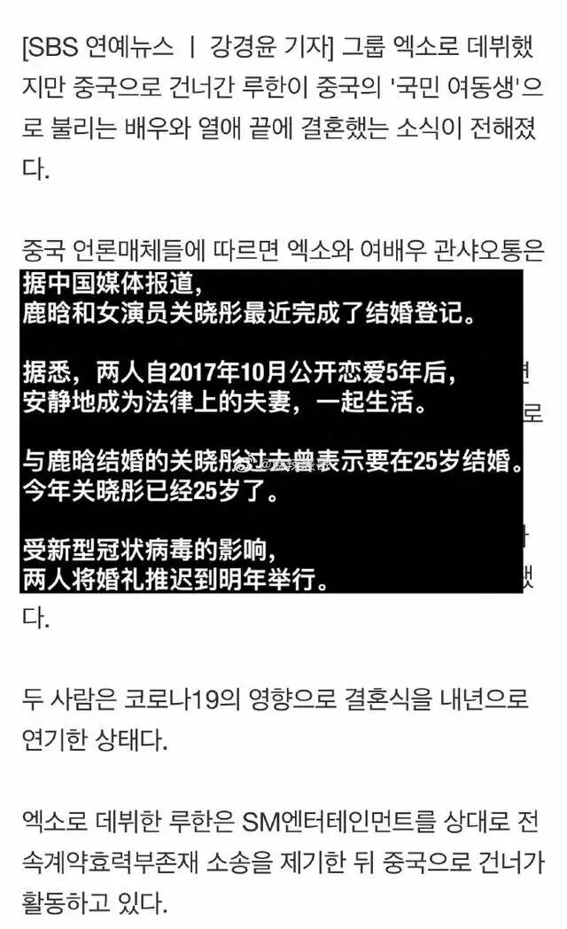 然而韩国媒体那边却说是根据中国媒体的报道,得知鹿晗和关晓彤最近完成了结婚登记,将会在不久之后举办婚礼。