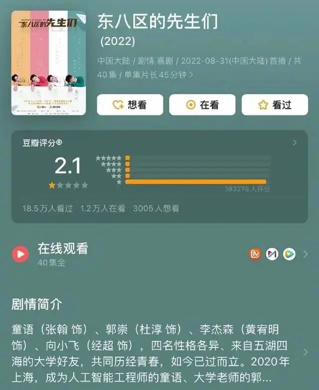 至于张翰为何会突然消失,其实跟《东八区的先生们》开播后争议不断有很大的关系,因为口碑和评分实在太糟糕了,糟糕到创下了历史新低,在豆瓣上评分只有2.1分,在所有电视剧里头排名是垫底的。