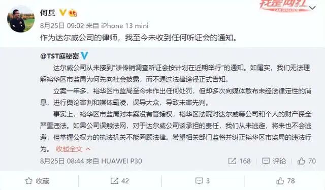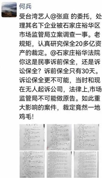 在今年五月份的时候,何兵突然通过朋友圈发文表示,已经受到了张庭的委托,全权处理其名下企业被石家庄裕华区市场监管局立案调查一事,将会认真研究保全20多亿资产,也就是说将会通过诉讼的方式,帮助张庭夺回被冻结的资产。