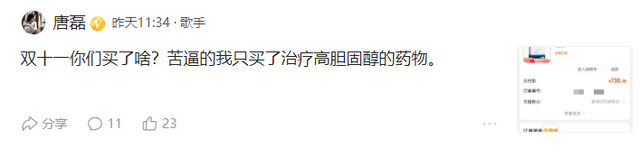 日前,知名男歌手唐磊通过社交账号晒出了双十一购物清单, 表示只买了治疗高胆固醇的药物,其它什么东西都没有买,为自己的人生感到苦逼难受,但又没有办法去改变现状,身体状况显然不是很好,让不少歌迷感到担忧。