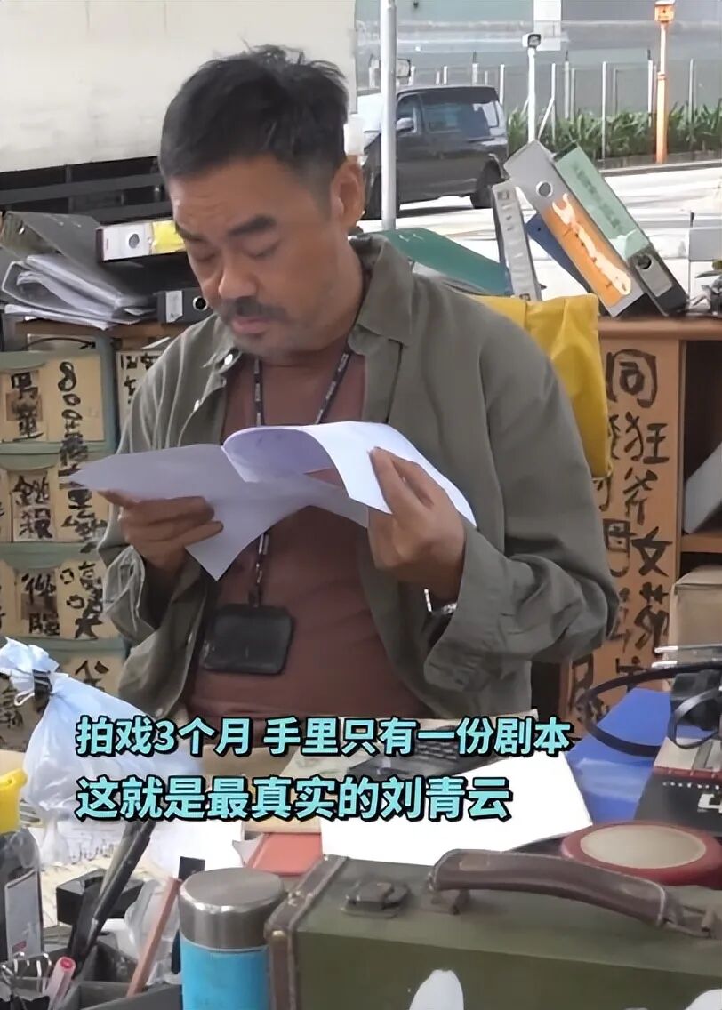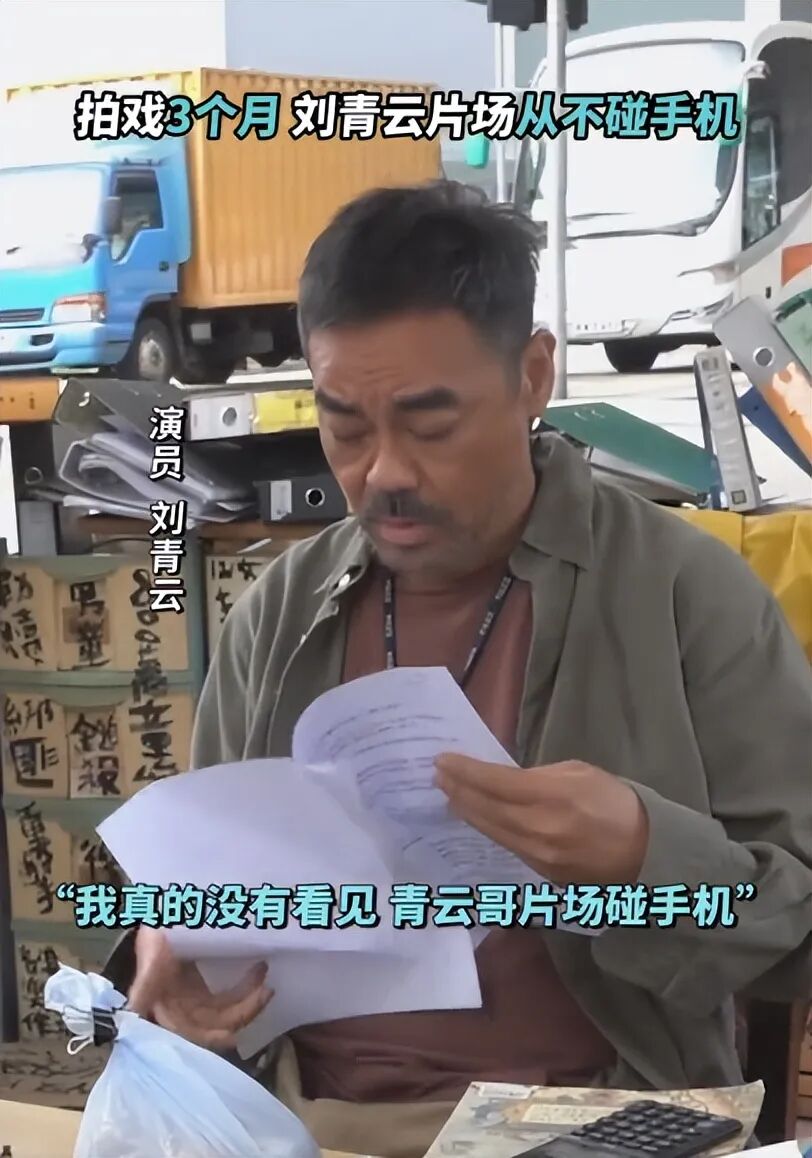 从片场拍摄的花絮来看,刘青云确实没有碰手机,而是拿着一大沓剧本正在认真地研读,旁边的工作人员几乎个个都是手机不离身,形成了强烈的反差。