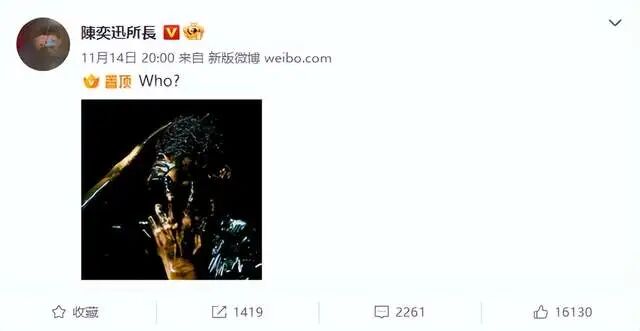 日前,知名男歌手陈奕迅通过微博晒出了一张全身被黑色油脂覆盖的照片,造型十分的诡异,根本就看不清正脸,而他却只用了一个英文单词“Who”来表达想法,引起了很多歌迷们的猜测,认为他有可能要发新专辑了。