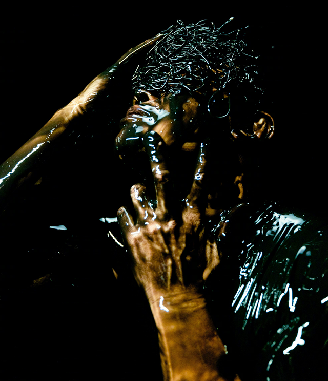从照片中可以看出,这就是很典型的行为艺术,由于身上覆盖了黑色油脂,人物也因此被模糊化了。虽说看不清楚正脸,也很难分辨出是谁,但对于非常熟悉陈奕迅的歌迷而言,其实还是很好认出来的,因为手部特写还是比较明显的。