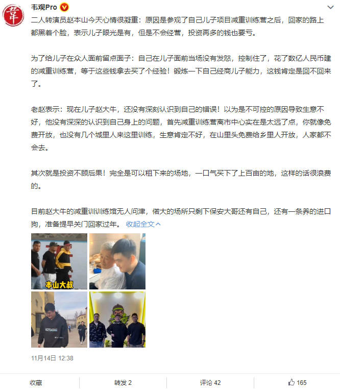 日前,知名作家韦观在微博上爆料称,赵本山带人去儿子赵一楠创办的减脂训练营视察工作,到了营地后发现冷冷清清,没有几个学员在里头,后来查账后得知亏损比较严重,但考虑到给儿子留面子,赵本山当场没有发怒,而是黑着脸就回家了。
