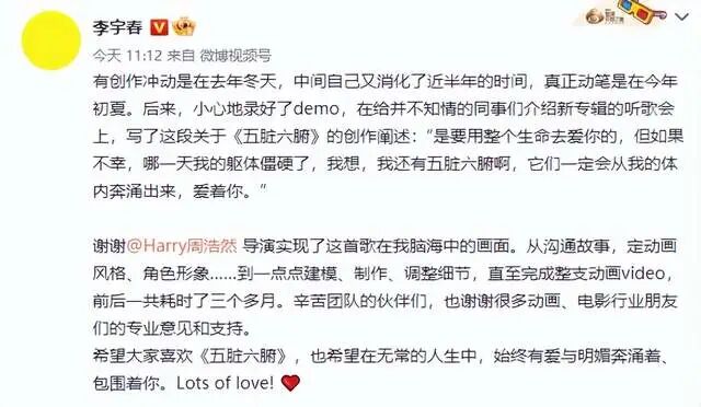 近日,知名女歌手李宇春以强直性脊柱炎患者第一视角创作的新歌《五脏六腑》,在经过将近半年时间的制作之下,终于上线与广大歌迷见面了。同时她在第一时间通过微博写下了创作阐述,却像是留下遗言的感觉,令人感到特别的心痛。