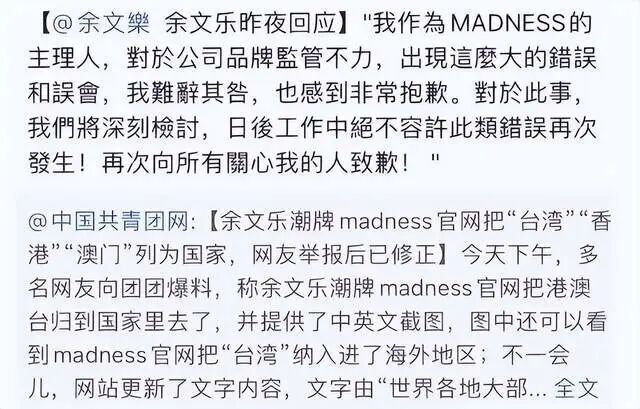 实际上,余文乐已经不是一次两次在危险边缘游走了,像之前创办的潮牌网店,直接把港澳台划分到国家范畴,甚至还将中国台湾纳入进了海外地区,遭到了全网的炮轰和谴责,后来也是迫于舆论压力公开道歉并表示会深刻作出检讨,保证不会再出现这种错误。