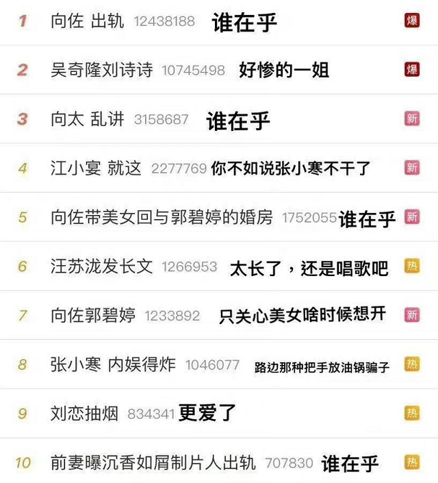 然而有趣的是,当得知江小宴预热已久的大瓜居然是向佐,纷纷表示失望至极,觉得有一种被戏耍的感觉,根本就没多少人关心向佐是否婚内出轨,因为大家的焦点统统都放到吴奇隆和刘诗诗的身上,其实从热搜话题就可以找到答案。