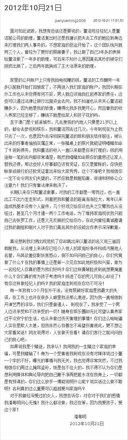 后来忍无可忍的潘粤明,发长文回怼了董洁的经纪人,否认自己好赌也没有欠过债,对家庭问心无愧,对妻子和孩子是没有任何亏欠的。