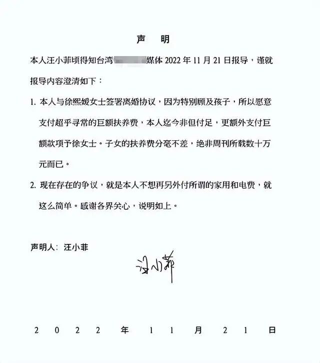 除此之外,汪小菲还委托了台湾那边的律师对外发布声明,称给大S和子女的抚养费分毫不差,只是不愿意另外支付家用和电费。
