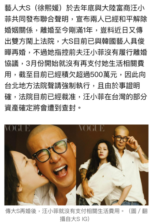 日前,据多家台媒对外爆料称,自打大S跟具俊晔结婚后,汪小菲便没有继续履行离婚协议,按月支付大S及两个孩子的生活费,现在积欠金额高达500多万。为了能够拿到这笔钱,大S决定向台北地方法院申请强制执行,但结果却彻底惹怒了汪小菲,扬言要爆大S一家的黑料。