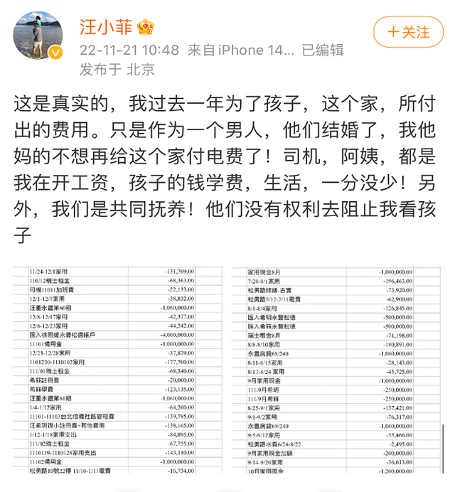 为了证明自己所述为实,汪小菲还特意晒出了家用支出表格,详细记录了过去一年的汇款明细。