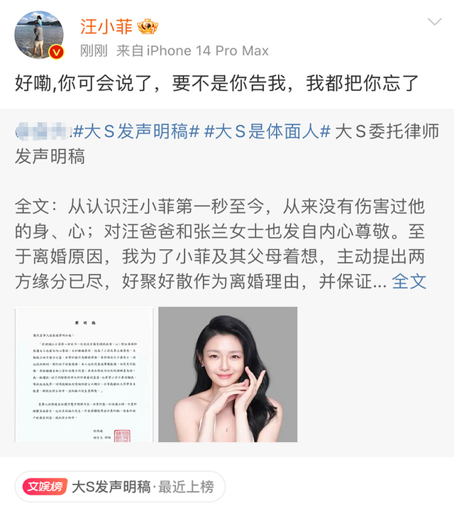 也就是说,即便汪小菲和大S离婚了,他心里头还是念念不忘的,而在微博里头其实是可以感受到一股爱而不得的愤怒感。汪小菲说要不是大S告他,都快要把对方忘了,这显然是不现实的,而仅仅只是气话而已。