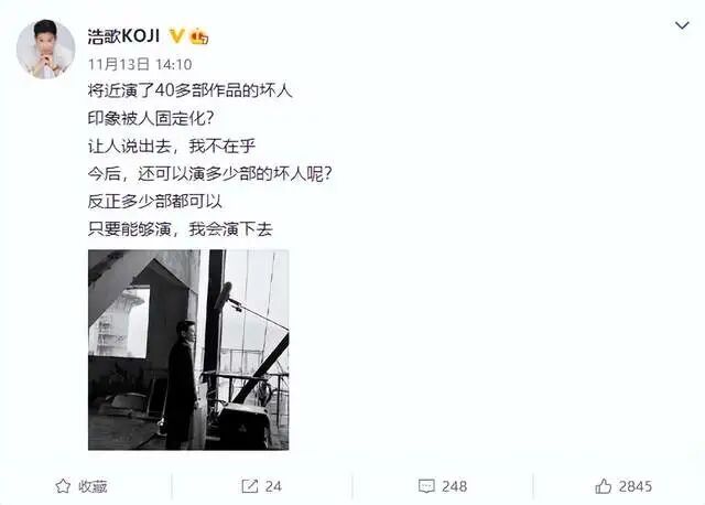 日前,日本知名男演员矢野浩二通过微博晒出了一张在拍戏时的黑白照,罕见发文透露心声,说自己在中国演了将近40多部作品,演得几乎都是坏人,不害怕印象被人固定化,也不在乎别人怎么看他,只要能够演就会一直演下去。