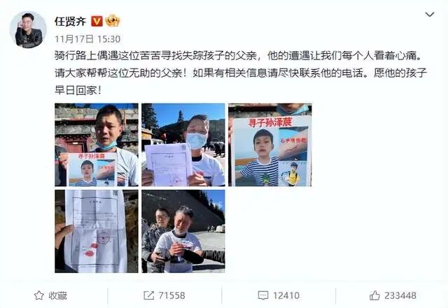 然而最让人印象深刻,同时也是最让人值得钦佩的就是,任贤齐在骑行路上偶遇到了寻找失踪孩子的父亲,然后就通过自己的微博,又是拍照又是发布相关信息,只为尽绵薄之力能够帮助到这位寻孩父亲。