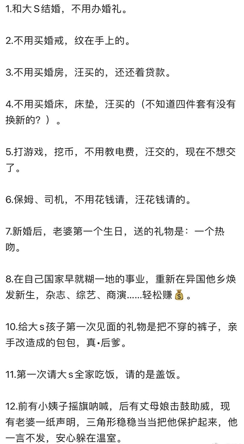 后来双方登记结婚之后,具俊晔名正言顺拎包入住大S家,也就是汪小菲当年花了将近1个亿,至今每个月还供着100多万房贷的豪宅。可具俊晔为大S做了一些什么呢,有人就特意列出了一详细清单,活脱脱就不像是一个顶天立地的丈夫,更像是一个被收养回家的小孩。