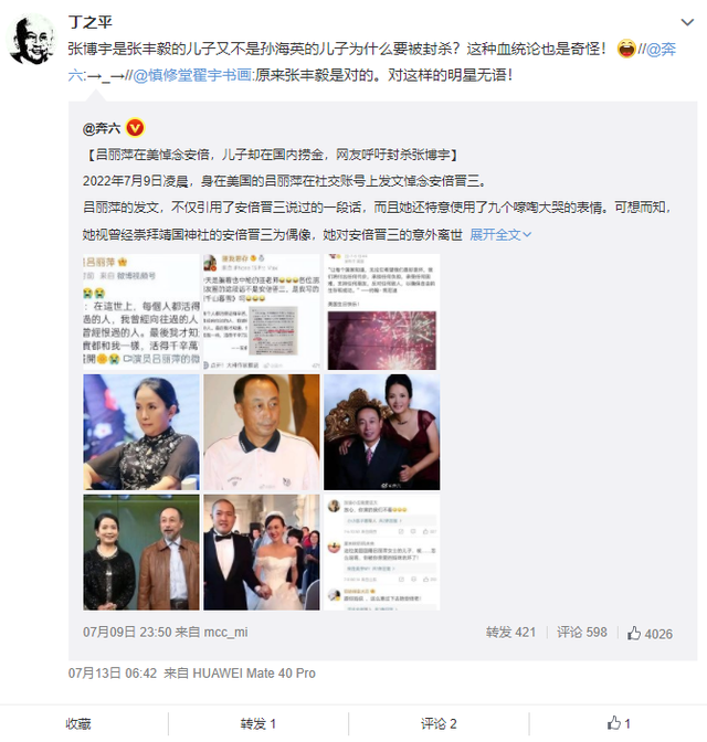 再者,张博宇同样也是张丰毅的儿子,不能因为吕丽萍是他妈,就无视张丰毅这个当爸的,像这种“血统论”就不应该存在,希望能够理性去看待此事,不要迫害无辜者。