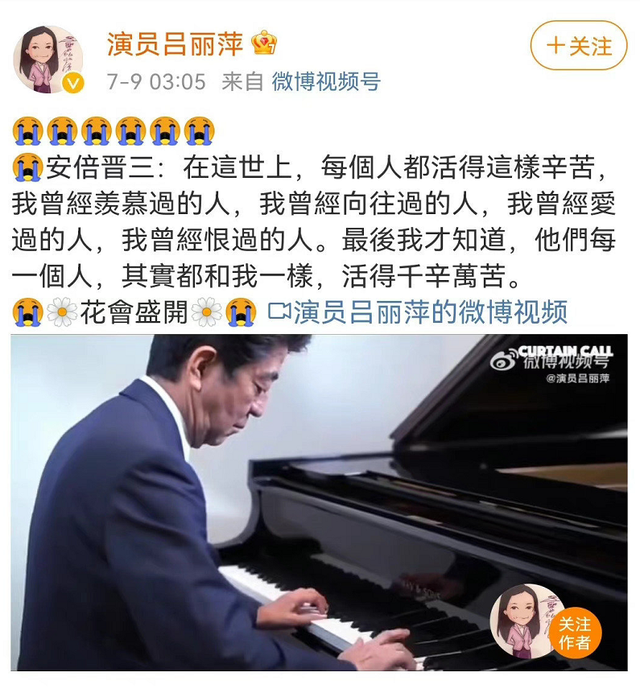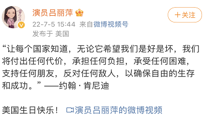 客观来讲,吕丽萍被禁言是咎由自取,但其实也是有迹可循的,因为在安倍晋三被枪击的几天前,她就在微博上公然发表“亲美言论”,不仅引用美国总统肯尼迪的爱国言论,而且还给美国送上了生日祝福。