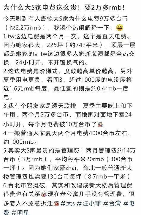直到后来,知名狗仔葛斯齐在接受媒体采访时,透露出了大S家用电量巨大的原因,一方面是豪宅面积大,另一方面是开了地暖,还有一方面就是阶梯电价贵,综合起来的话就有这么多钱的电费,在富人群体里头算是比较正常的用电量。