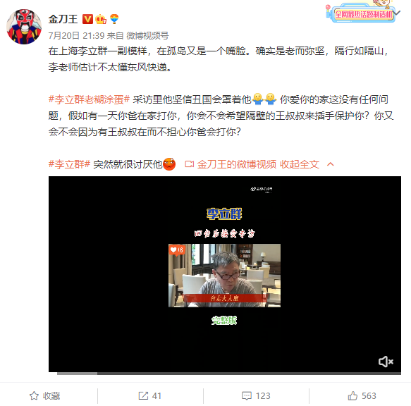 至于台媒有没有断章取义,设局下套,故意挖坑让李立群跳,但凡看过他采访视频的人应该最清楚不过,他典型就是人在哪个山头就唱哪个山头的歌,包括此前在上海居家隔离期间,就内涵过当地政府“多磕头,少说话”。
