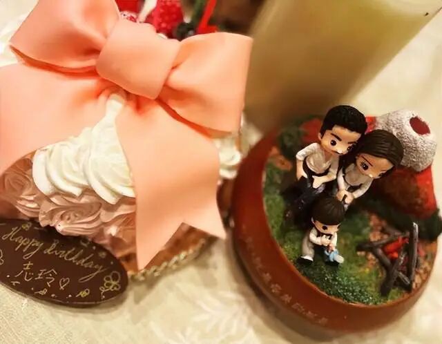 而蛋糕上的人物正是林志玲一家三口,虽说比较抽象,但基本上符合人物特征,像黑泽良平的浓眉小眼和小胡须,林志玲的长发大眼和瓜子脸,而儿子明显继承了林志玲的优良基因,一双大眼睛,以及细嫩的皮肤。