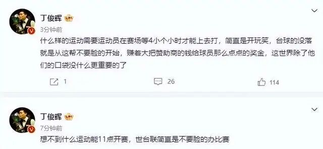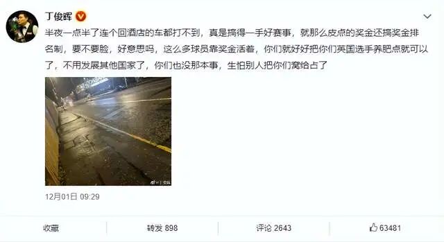 日前,知名台球运动员丁俊晖通过微博怒怼世台联,称自己打完比赛后连回酒店的车都叫不到,关键是比赛的奖金不多,还这样子去折腾外国选手,还不如不发展其他国家,好好把英国选手养肥就行了。