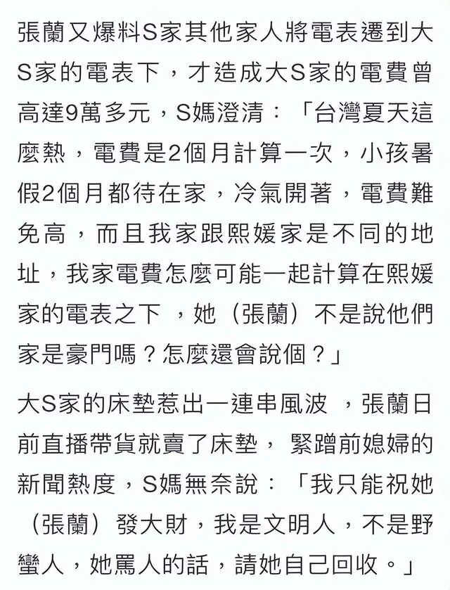 至于张兰在直播时爆料四户电表接一户,大S妈表示这完全不符合逻辑,因为她家跟大S家不在同一个地址,电费怎么可能一块计算到大S家电表里头,这显然是说不过去的。同时,她还不忘带有讽刺的口吻隔空回呛张兰,说她是豪门却拿电费的事情大题小做。