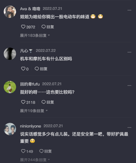 比如就有车友在评论区留言说道:“姐姐为啥给你骑出了一股电动车的味道。”甚至有的车友一针见血指出毛病,说沈梦辰骑摩托车有点儿装,关键是连护具都没有戴,不把自己的安全当一回事,而且很容易误导别人。