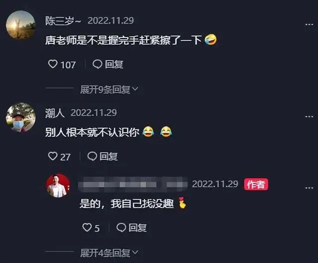 对此,很多网民看到金波发出来的视频后,在评论区里头提出种种质疑,其中就有人一针见血指出道:“唐老师是不是握完手赶紧擦了一下?”
