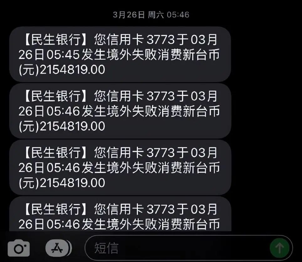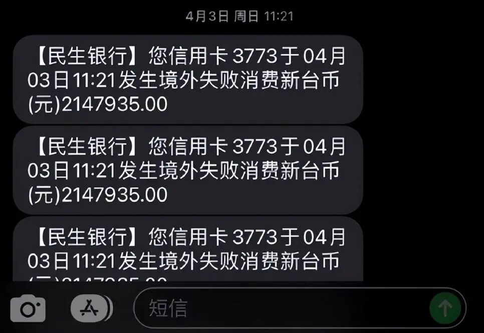 后来又到了4月3日上午,又刷了3笔2147935元新台币,同样短信也提示失败。