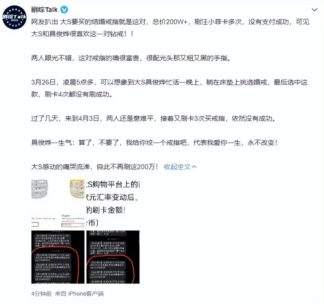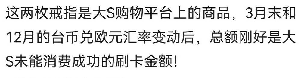 再根据大S喜欢的一些大品牌,有人就迅速找到了一对结婚用的钻戒,总额刚好能跟大S未能消费成功的刷卡金额对上。