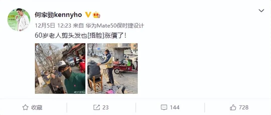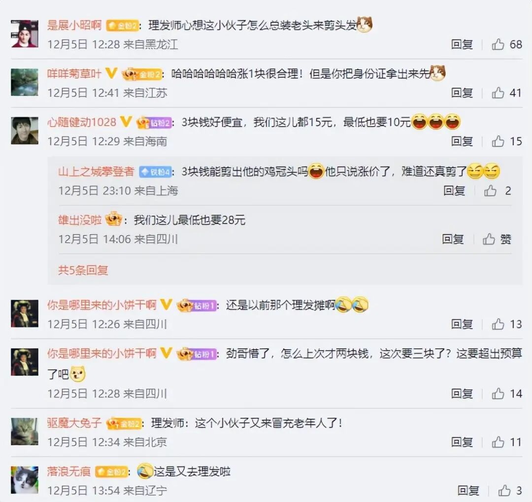虽说何家劲没有晒出自己在街头剪发时的照片,但是从他说话的口气来看,应该是有经常光顾这种街头理发的,要不然也就不会知道理发涨价的情况。