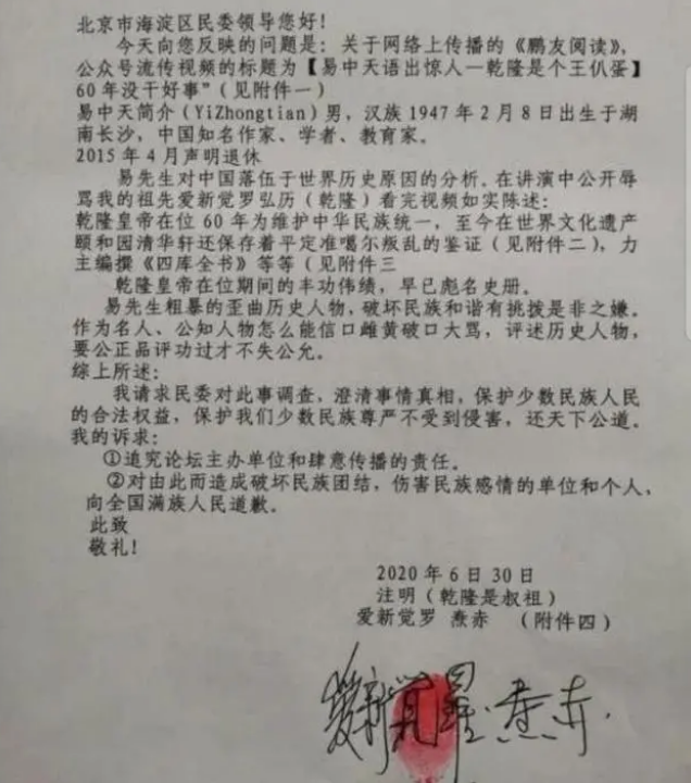值得一提的是,在两年前的时候,知名历史作家易中天在节目中骂乾隆是乌龟王八蛋,说他在位的时候没干什么好事。后来被乾隆的后人,一位名叫爱新觉罗·焘赤的人给举报了,理由是易中天歪曲历史人物,破坏民族和谐,并在文末备注了自己的身份,乾隆是叔祖。