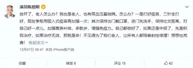 日前,老戏骨陈旭明突然有感而发,在微博上发文谈论疫情放开,说自己除了是一个演员以外,同样也是一个普普通通的老人,有高血压基础病,该做的防护都做到位了。如果哪一天不幸中招了,那就积极主动去治疗,要是治疗无效只能认命,不想拖累所有人停摆。