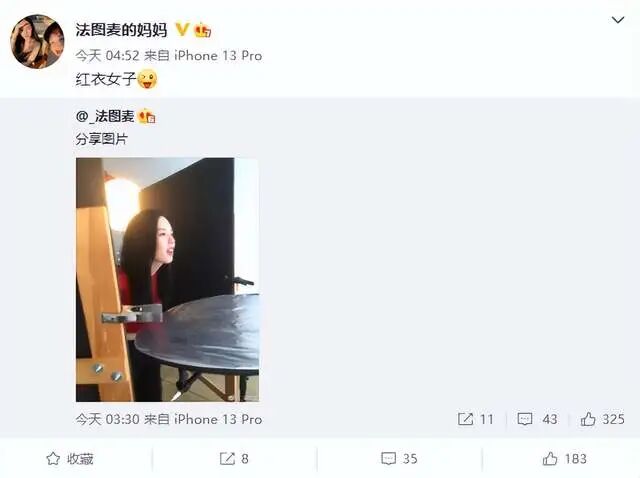 看到法图麦晒出美照,自然少不了她妈妈哈文的加油打气,直接转发微博并评论道:“红衣女子。”不难想象,在摄影棚里头偷偷对着法图麦拍照的人,极有可能就是哈文,要不然她也不会发出调皮的表情符号。