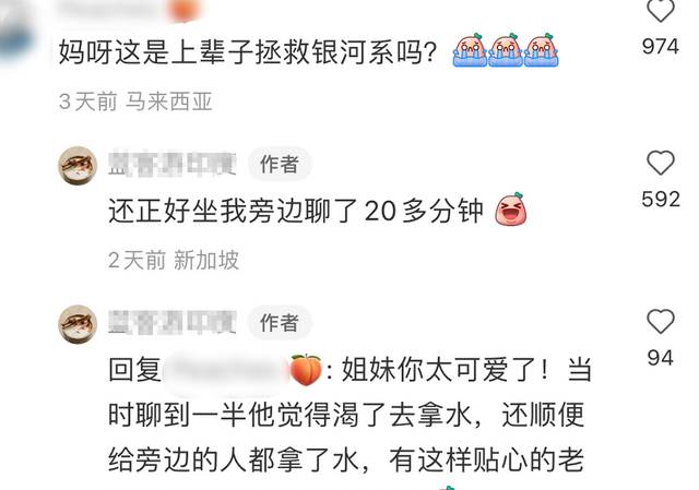不过还有一个小细节,在婚礼上偶遇宋仲基的网友透露称,她跟宋仲基是坐在一起,两个人聊了差不多20多分钟,可当聊到一半的时候他有些口渴,就去边上去拿水喝,还顺带给别人拿了水,可以说特别的贴心温暖,亲和力十足。