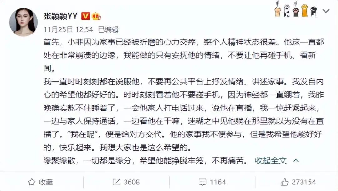 值得一提的是,张颖颖确实挺关心汪小菲的,在微博上透露了对方近况不容乐观,说因为家事被折磨的心力交瘁,精神状态很差,情绪极其低落,一直处于崩溃的边缘。