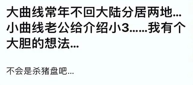 除此之外,自打汪小菲和大S彻底闹僵之后,尤其是汪小菲晒出支出明细,以及大S刷卡消费记录后,有不少网民就提出了一个大胆的想法,说汪小菲很有可能是掉进杀猪盘里头了。