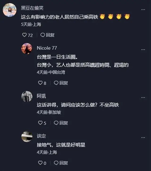 对此,很多内地影迷看到后,纷纷表示万分惊讶,说李立群这么大的一个明星,居然独自一人去乘高铁,这在内地还是比较少见的。对此,有来自台湾的网民回应道,很多台湾籍艺人都是搭高铁赶时间的,这个跟名气大不大没有关系。