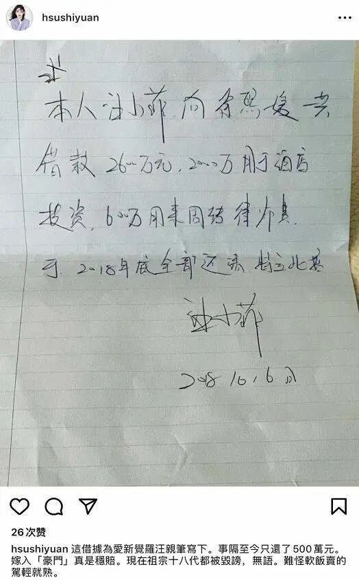 这也就是导致了忍了很久很久,表示不会出恶言的大S,终于崩溃破防了,在社交平台上对汪小菲进行反击,不仅晒出了手写借条,还晒出了转账记录,以此来证明自己是有钱的,并非网传所述的那样要靠汪小菲来资助过日子。