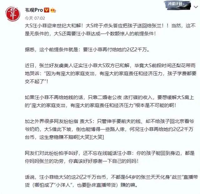 近日,据知名作家韦观在微博上爆料称,汪小菲和大S迎来世纪大和解,说是双方已经达成共识,大S同意把孩子送回到张兰身边,但前提条件就是汪小菲得额外再支付2.2亿元,理由是家庭支出压力非常巨大,靠现任丈夫具俊晔在夜店打碟挣得钱是远远不够,再次引发了不小的热议。