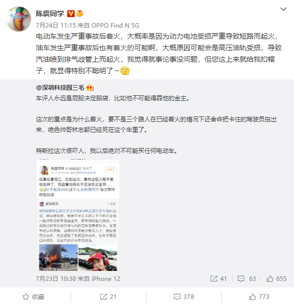 比如知名车评人陈震,也就是当年被誉为“二环十三郎”的顶尖车手,再次通过微博谈到林志颖车祸一事,并正面回应了车友此前对他分析事故原因的质疑,他表示自己只是就事论事,否认特斯拉是金主爸爸,觉得给他乱扣黑帽子的人是不聪明的。