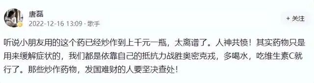 日前,知名歌手唐磊在社交平台发文痛斥黄牛,说小朋友用的退烧药都已经炒到上千元一瓶,太离谱了,人神共愤,希望有关部门能够严肃查处这些发国难财的人。同时他还强调称,药物只是用来缓解症状的,关键还是要依靠自身的抵抗力去战胜病毒。