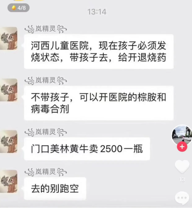 不仅如此,他还晒出了一张微信聊天截图内容,说现在儿童医院药物紧张,很多买不到药的家长,被逼无奈只能找医院外面的黄牛,然后高价购买退烧药,一瓶就要2500元,甚至有的黄牛卖的价更高。