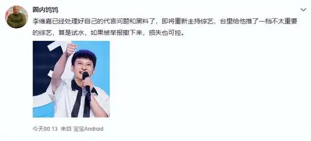 除此之外,也有不少网民在微博上爆料称,说李维嘉已经处理好代言问题和其它黑料,将会重新回归到芒果台,继续主持综艺节目,但并不会给他很好的节目去做,这也算是试水,看一下后面的舆情走势。