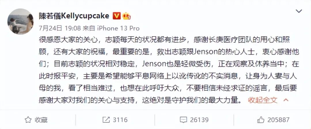 7月24日晚,知名男演员林志颖在遭遇车祸后,他的妻子陈若仪通过微博发文报平安,称林志颖目前状况良好,儿子Jenson也正在休养中,非常感谢出手相救的热心人士,同时也希望以讹传讹的不实消息能够被平息,请大家不要相信未经求证的谣言。
