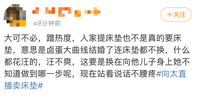 显而易见,她这是在一语双关,话中带话,在宣传自己卖的床垫好的同时,还不忘内涵了一把汪小菲,意思就是在隐射汪小菲小气,不应该为了一个床垫闹成如此大的笑话。