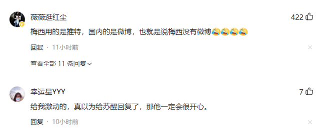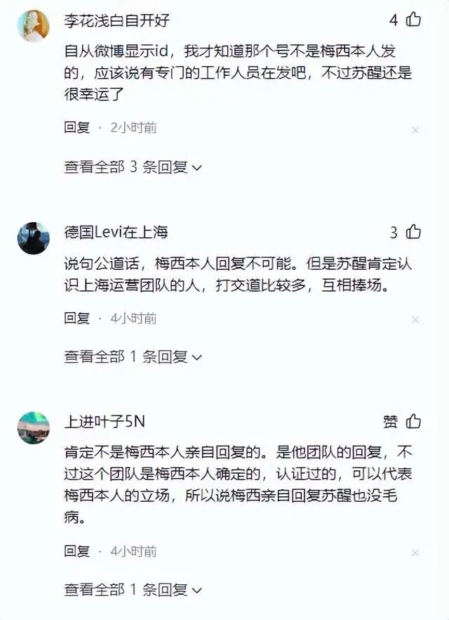 当然还有一个细节,可以证明在微博上回复苏醒不是梅西本人,那就是苏醒至今都没有回复,反倒却回复了王铮亮的留言,哪怕底下有很多歌迷提醒他,也都无动于衷,没有做出任何回复。