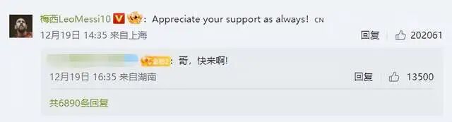 可让人万万没想到的是,夺冠后的梅西突然现身苏醒的微博评论区,同样也是用英文留言回复道:“Appreciate your support as always!”翻译过来的意思就是,感谢苏醒对他一如既往的支持。