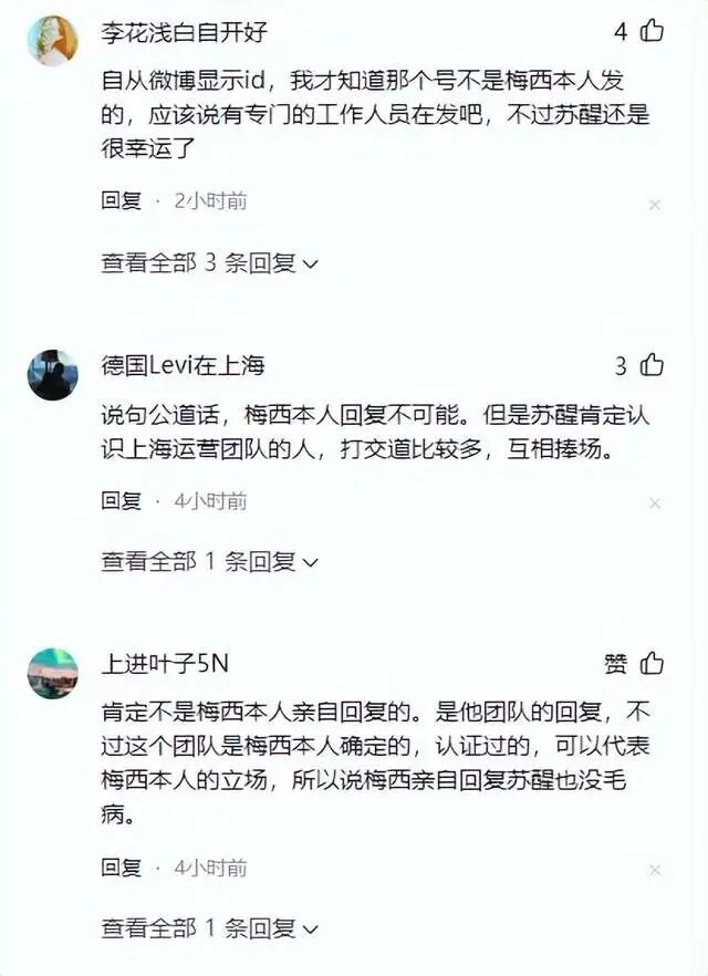 如此说来的话,梅西本人在微博上回复是不可能的,极有可能是他在中国这边的运营团队负责,而苏醒作为梅西多年的铁杆球迷,自然也认识梅西在中国这边的运营团队,要不然也不会以所谓装作没看见的态度去对待微博上的梅西。