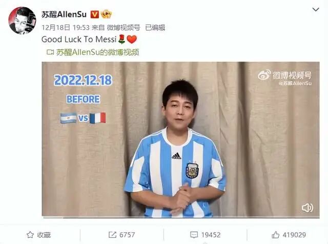 有因必有果,梅西为何要回复苏醒,这个就得从世界杯决赛前夕说起,当时苏醒特意录了一个视频给梅西加油打气,说他给球迷们带来了快乐和希望,也从不欠任何人一个世界杯,但非常希望他能够拿下今年的世界杯,因为他值得拥有最好的,最后送上了用英文祝福“Good Luck To Messi”。